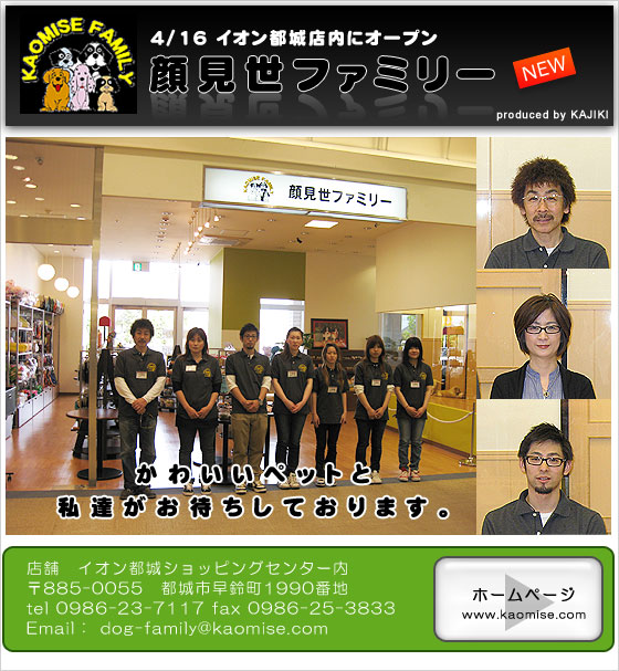 犬と飼い主が安心・安全・快適に暮らす家づくりをご提供。 デザイナーズホームKAJIKIが施工したドッグショップ「顔見世ファミリー」が、2009年4月16日にイオン都城店内にオープン致しました。かわいい犬達や明るいスタッフの方たちと同じように、店内も明るく清潔感あふれるイメージに仕上がりました。 オーナーはじめスタッフの方々は、何でも相談できる雰囲気の方々です。「犬を飼いたい。」、「かわいい犬たちに癒されたい。」、「犬について相談したい。」どんな事でも相談してみてください!