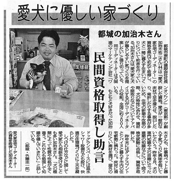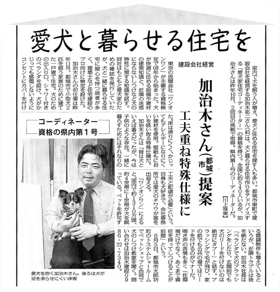 愛犬と暮らせる住宅を提供しているデザイナーズホームKAJIKIが、県内で初めて「愛犬家住宅コーディネーター」を取得し、毎日新聞(2010/05/21)および宮崎日日新聞(2010/05/31)に紹介されました。 「愛犬家住宅をもっと知りたい方」、「愛犬と暮らせる家をご検討中の方」などご興味のある方は、是非一度デザイナーズKAJIKIまでお問い合わせください。